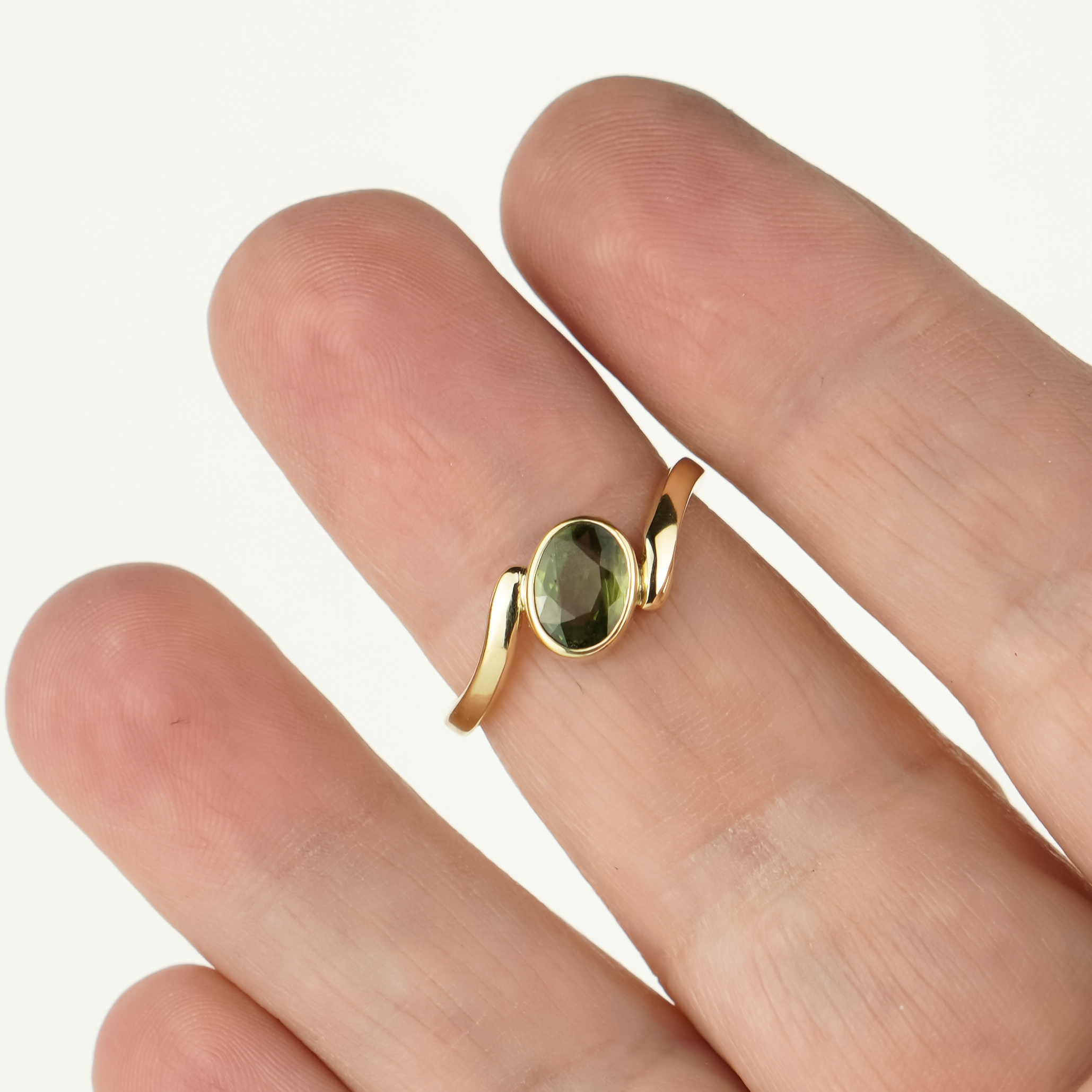 Een prachtige 14-karaats gouden ring met een ovale groene saffier. De tint beweegt tussen grijsgroen en een zachte olijfgloed. Een subtiele kleur met een rustige, natuurlijke ondertoon. De band loopt vloeiend langs de steen, waardoor het ontwerp beweging krijgt zonder druk te worden. Alles blijft in balans.